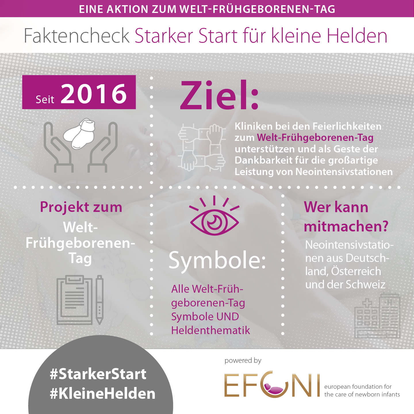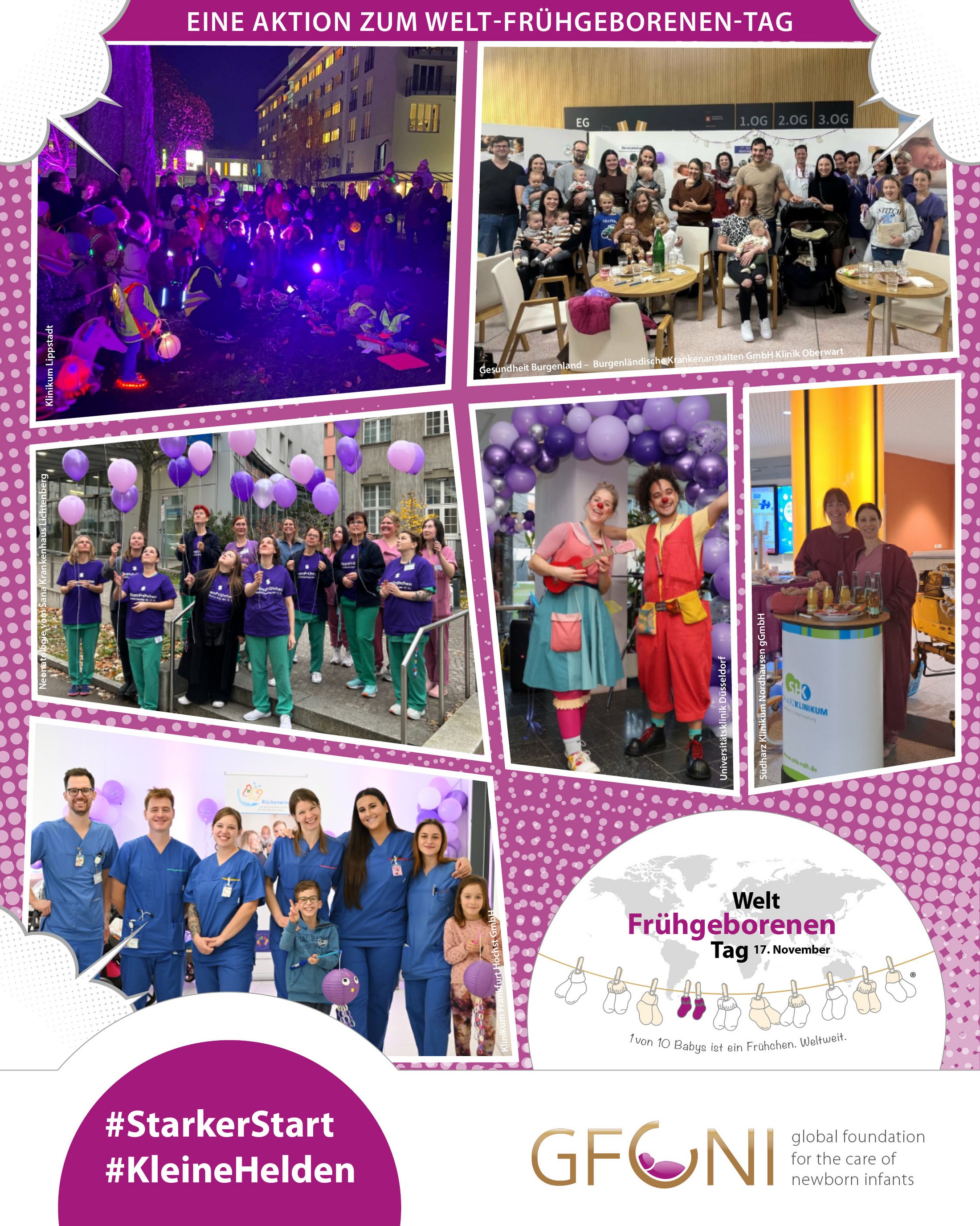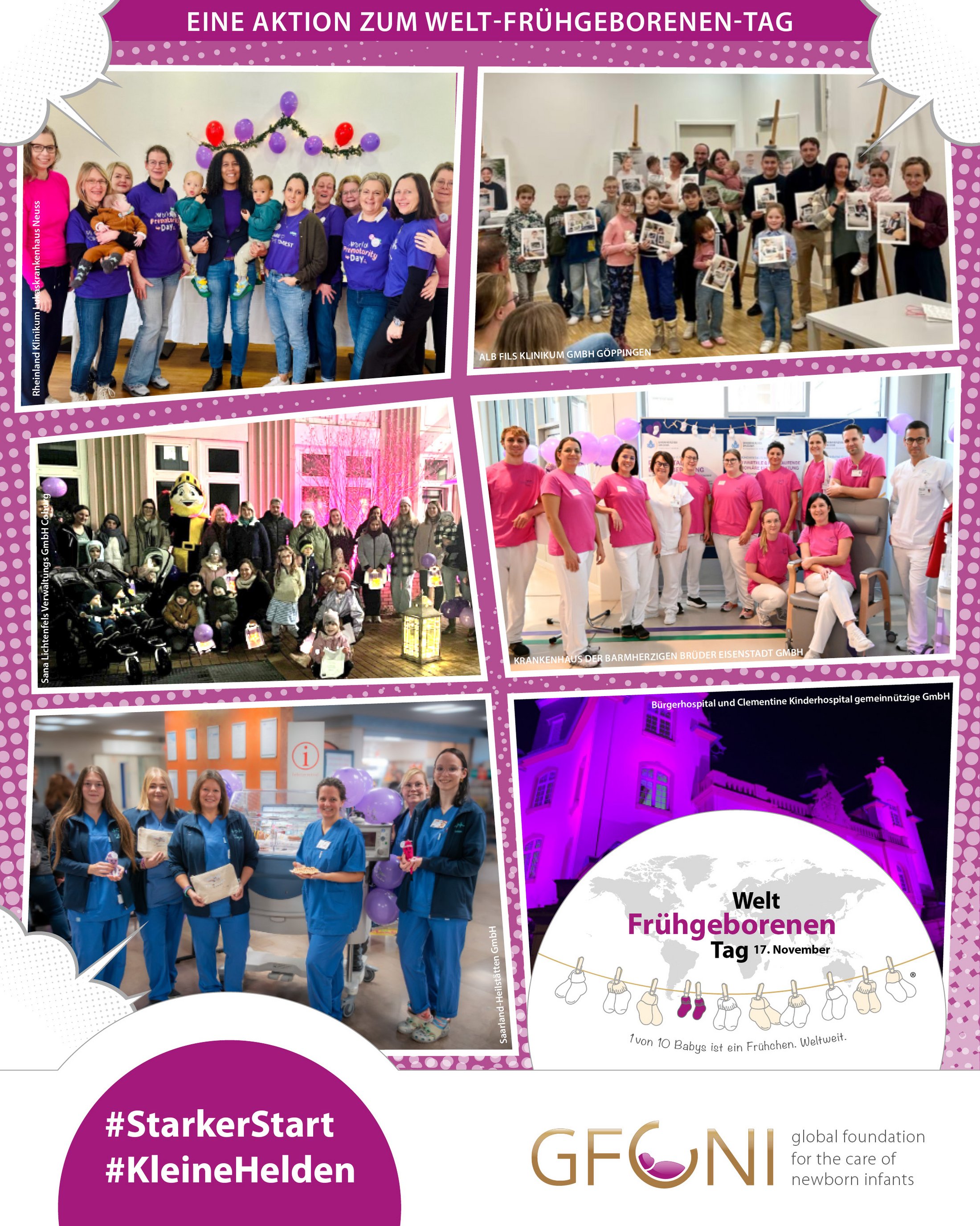 Anlässlich dieses bedeutenden Tages finden weltweit in mehr als 120 Ländern zahlreiche Aktionen und Kampagnen statt. Eine davon ist die Initiative „Starker Start für kleine Helden“, die neonatologische Intensivstationen in Deutschland, Österreich und der Schweiz dabei unterstützt, den 17. November trotz des anspruchsvollen Stationsalltags zu gestalten und zu feiern.