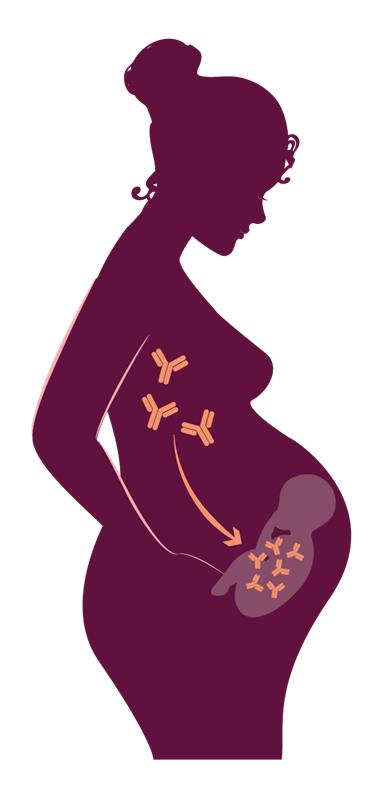 Illustration of a pregnant person showing antibodies being passed to the unborn baby during pregnancy after vaccination.