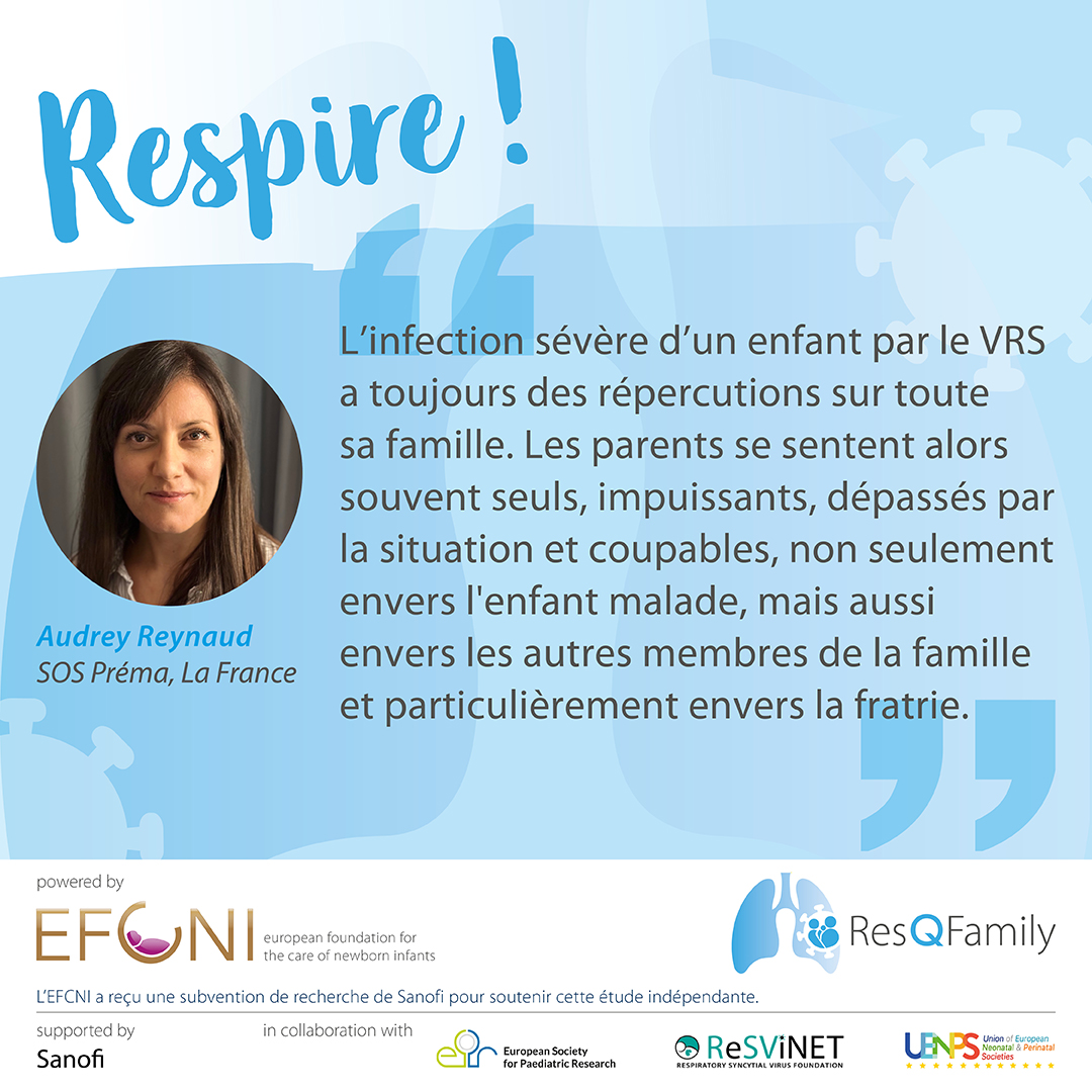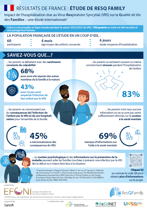 ResQ Family est un projet de recherche international mené par la Global Foundation for the Care of Newborn Infants (GFCNI), qui étudie l'impact des hospitalisationsdues au virus respiratoire syncytial (VRS) sur la qualité de vie des familles. L'étude fournit des preuves essentielles pour sensibiliser, améliorer les systèmes de soutien et promouvoir des mesures préventives afin de réduire le fardeau du VRS sur les familles à travers l'Europe.